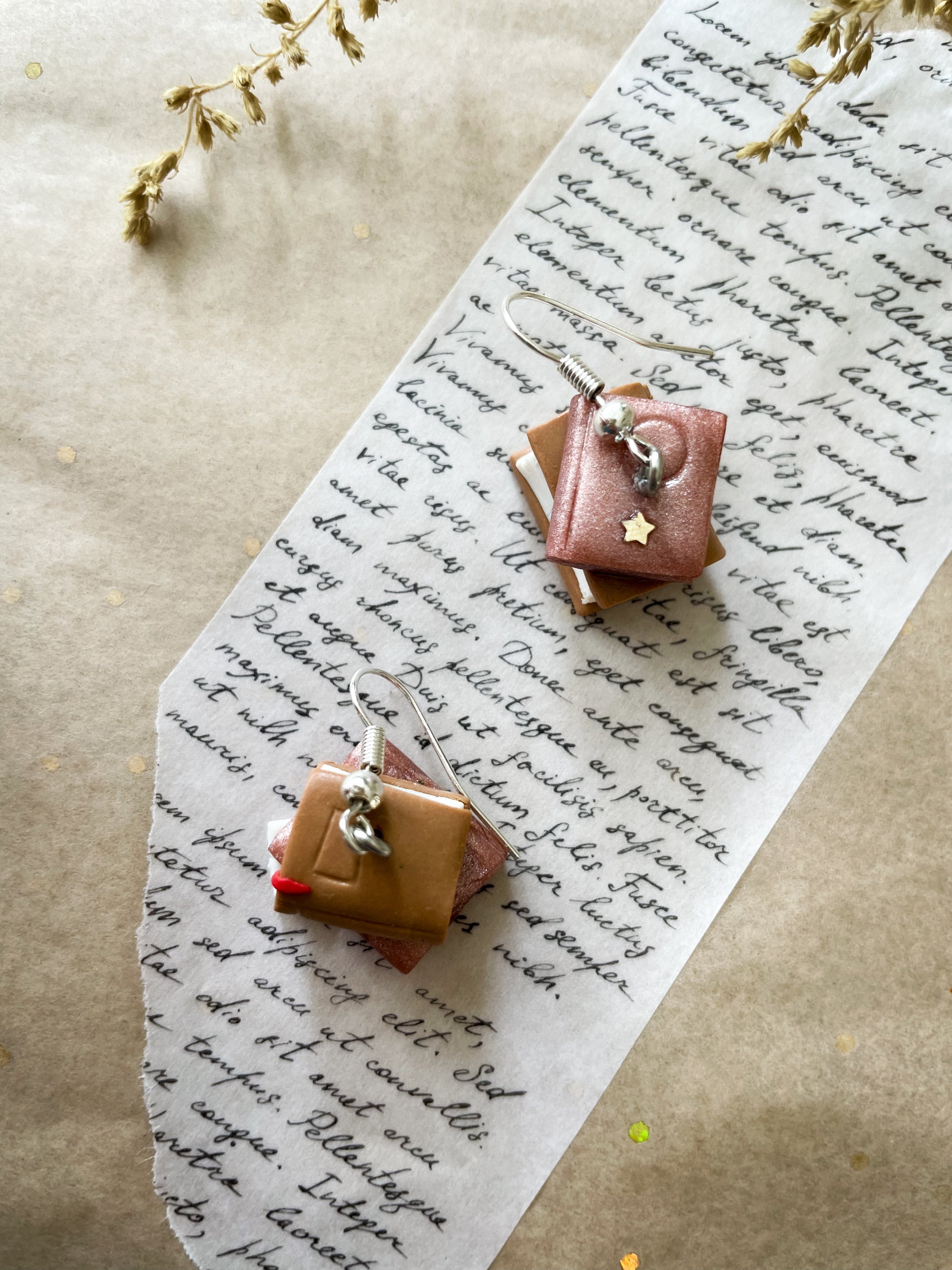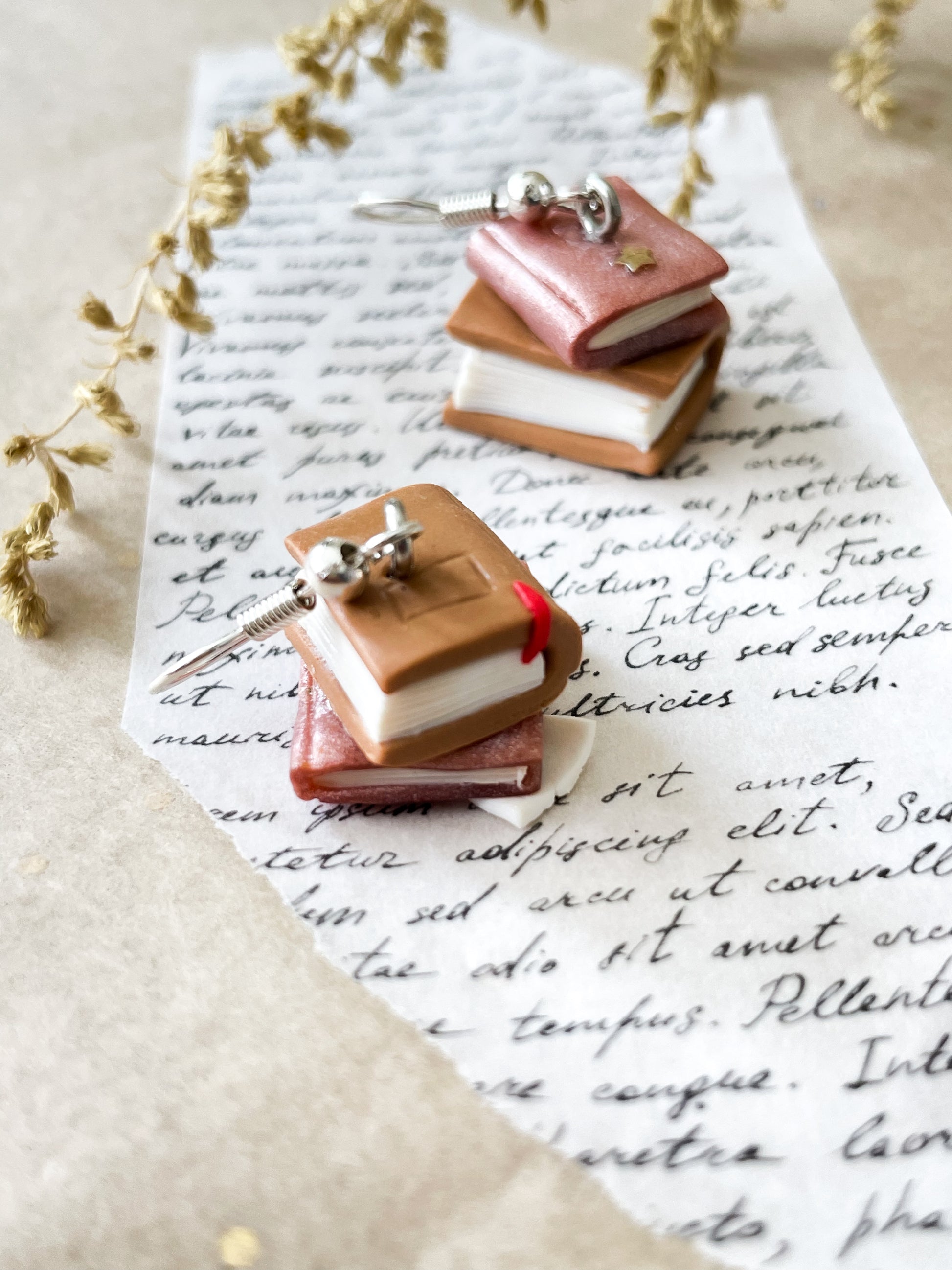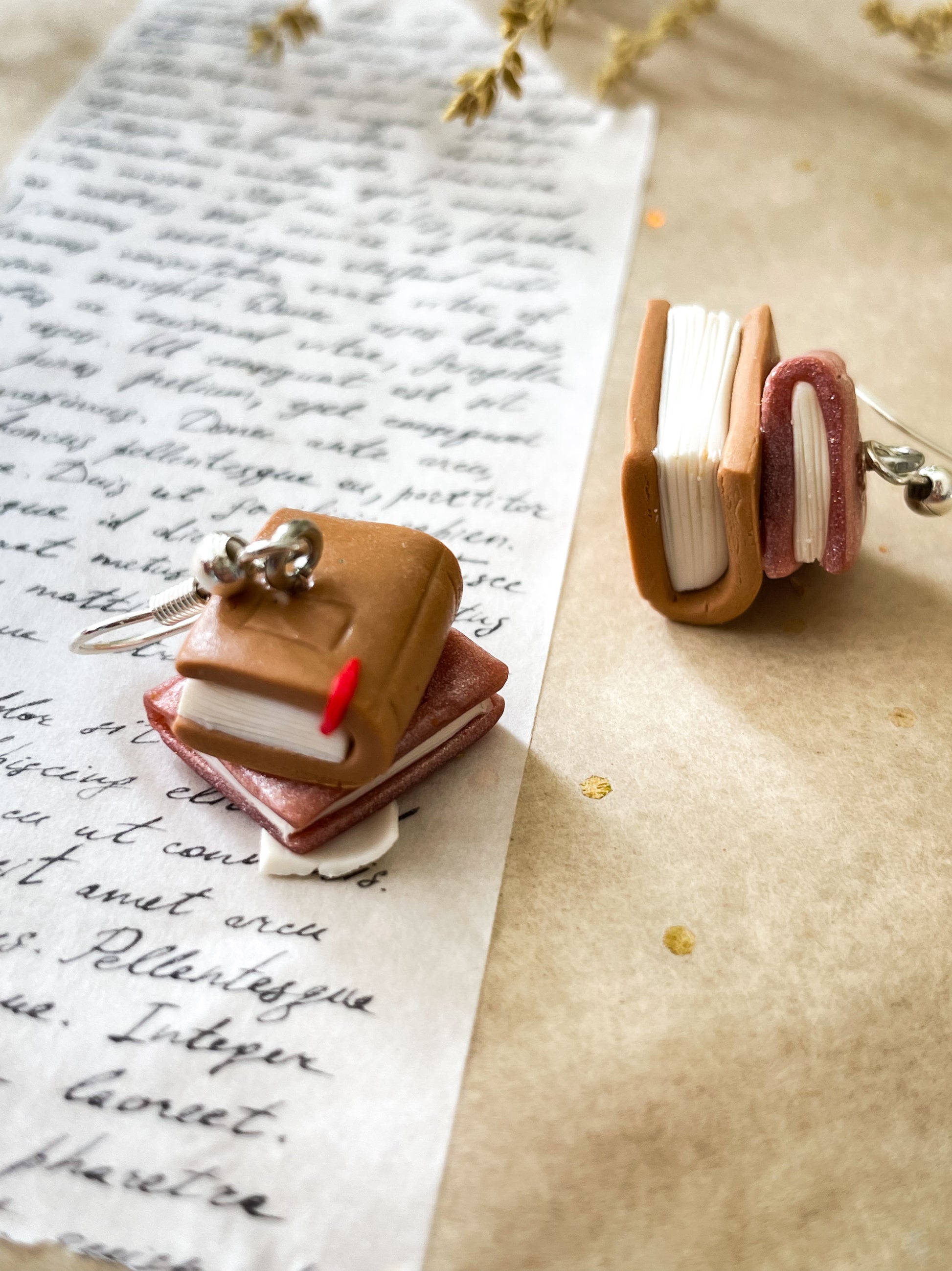 Pár náušnic v podobě knih. Každá je jiná, ale ladí 🩷🤎
